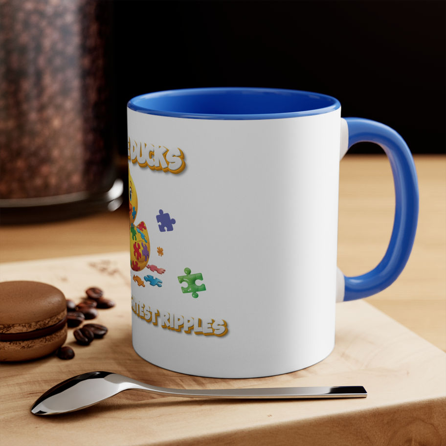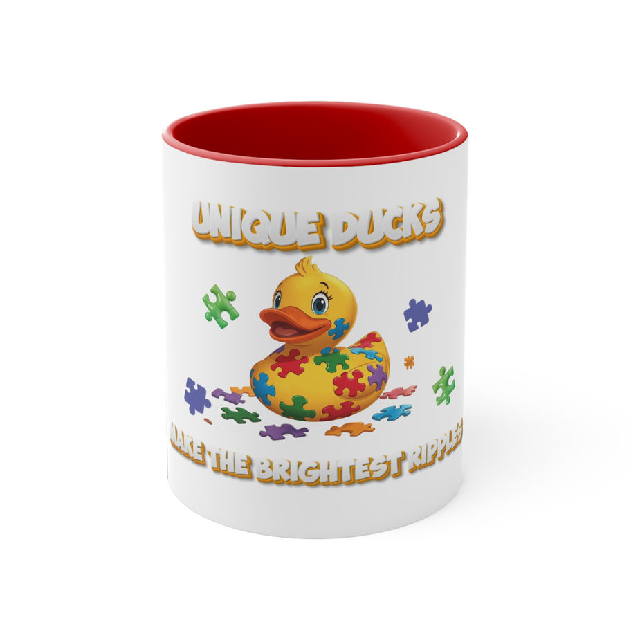 Autism Awareness Mug — "Unique Ducks Make the Brightest Kids" 11oz Color Accent