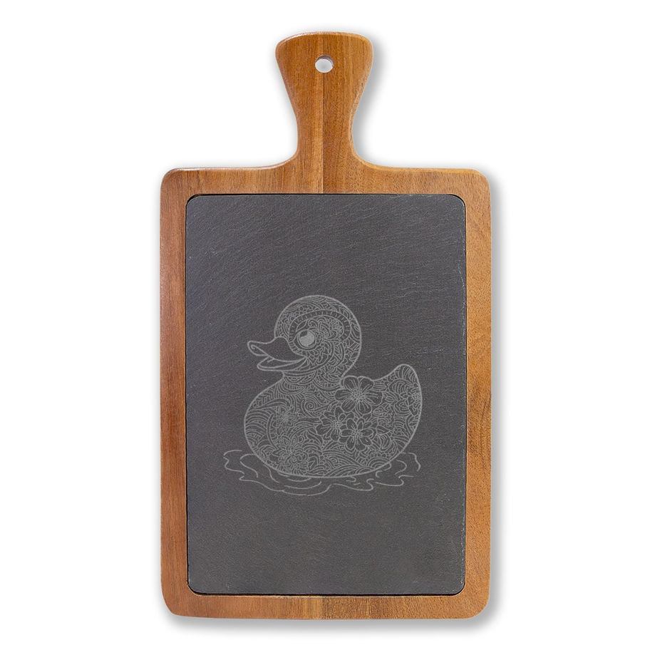 Warm, rustic, and thoughtful — this engraved acacia and slate charcuterie board brings a calm, handcrafted touch to gatherings. The smooth acacia frame cradles a removable slate round, etched with a delicate duck motif that lightens to a soft grey when engraved. Two compact cheese knives nest neatly into carved slots, keeping everything organized and ready for plating. Use the slate for soft cheeses or as a cool, elegant canvas for spreads; when the party’s over, lift it out for gentle hand washing and easy storage. It’s the kind of piece that turns casual snacking into a small, intentional moment around the table.